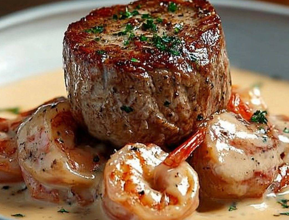 Насолоджуйтесь вишуканим святом вдома за цим вишуканим рецептом яловичого стейка з креветками та вершковим соусом. Ця страва ідеально поєднує ніжну яловичину з вишуканими морепродуктами, підкресленими вершковим соусом з насиченими ароматними нотками. Поєднання землі та моря, яке неодмінно вразить ваших гостей.