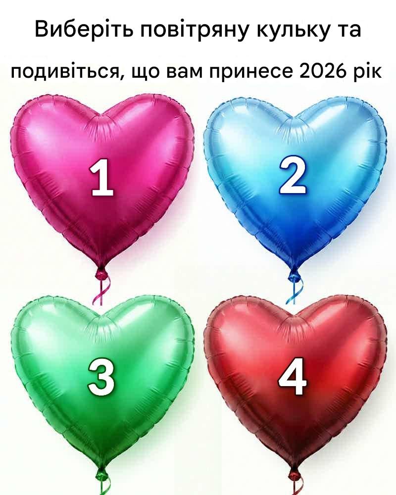 На перший погляд зображення просте і веселе: чотири кульки у формі серця, кожна різного кольору, кожна з цифрами від одного до чотирьох. Над ними — жирне запрошення: «Виберіть кульку і подивіться, що принесе вам 2026 рік.» Це відчувається легко, майже як гра — але під цією простотою ховається щось глибше у тому, як люди думають про майбутнє.