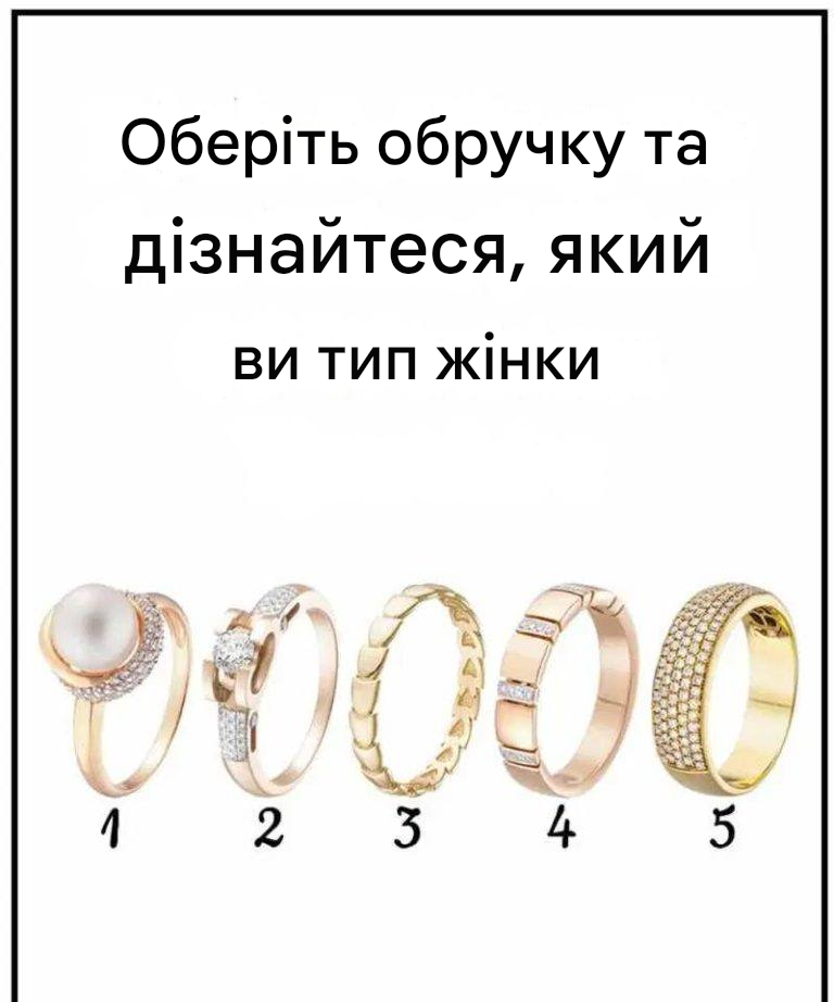 Подивіться на п'ять кілець на зображенні вище та виберіть ту, яка одразу ж вам подобається. Не вагайтеся, виберіть ту, яка вам найбільше підходить. Зробивши свій вибір, прочитайте опис нижче, щоб дізнатися, що ваш вибір говорить про те, яка ви жінка.