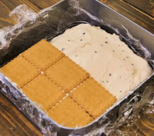 Покладіть печиво на дно каструлі розміром 9 × 9 дюймів, вистеленої поліетиленовою плівкою.