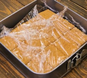 Зніміть харчову плівку, потім наріжте квадратиками.