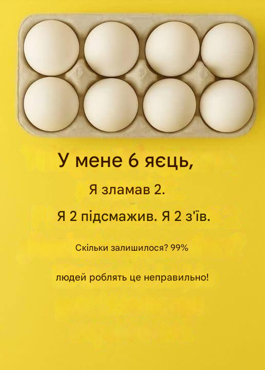 «У мене 6 яєць. Я розбив 2. Я посмажив 2. Я з'їв 2. Скільки яєць у мене залишилося?»