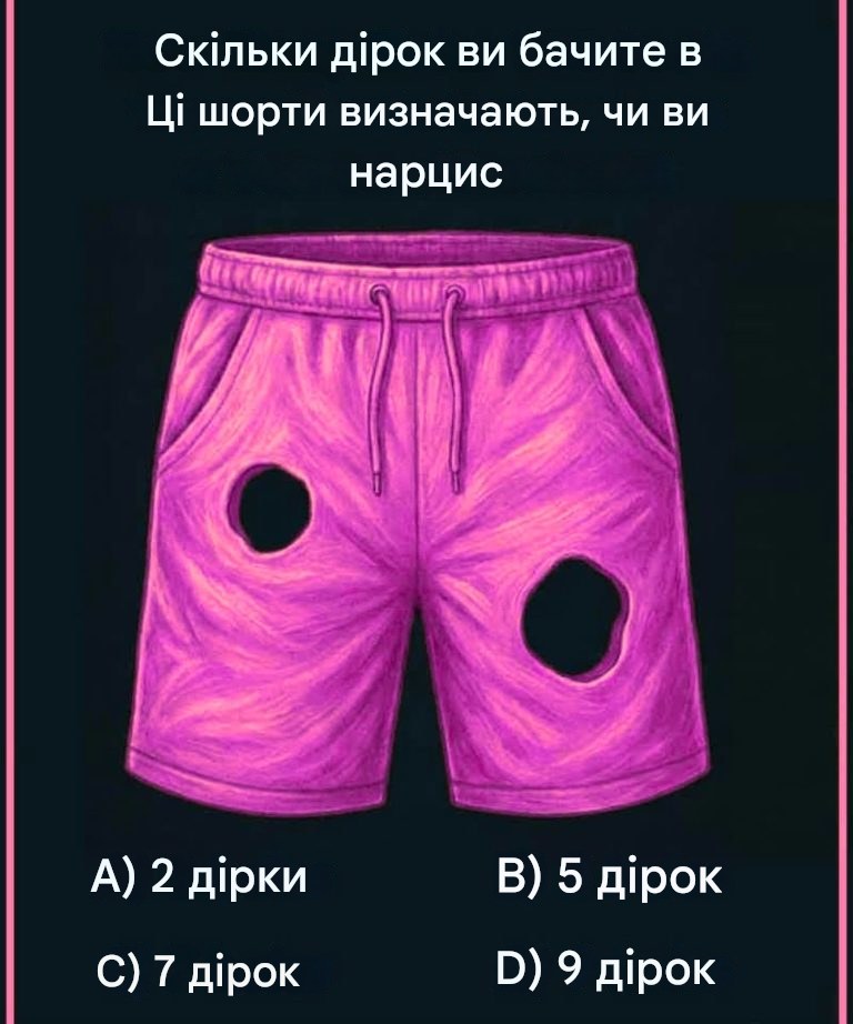 На перший погляд, це вірусне зображення здається не чим іншим, як парою пошкоджених шортів. Але щойно ви читаєте заголовок — «Скільки дірок ви бачите в цих шортах, визначає, чи ви нарцис» — ваш мозок одразу перемикається з пасивного прокручування в аналітичний режим. І саме тому ця оптична головоломка захопила соціальні мережі: вона ставить під сумнів ваше сприйняття, водночас дражнячи ваше его.