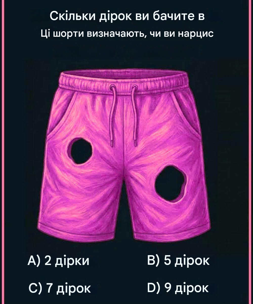 На перший погляд, це вірусне зображення здається не чим іншим, як парою пошкоджених шортів. Але щойно ви читаєте заголовок — «Скільки дірок ви бачите в цих шортах, визначає, чи ви нарцис» — ваш мозок одразу перемикається з пасивного прокручування в аналітичний режим. І саме тому ця оптична головоломка захопила соціальні мережі: вона ставить під сумнів ваше сприйняття, водночас дражнячи ваше его.