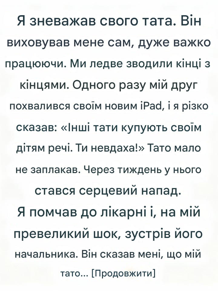 Я тремтіла, пробігла через двері лікарні, груди стиснулися від страху та жалю. Поки я сиділа в коридорі, чекаючи новин, знову і знову прокручуючи свої слова, до мене підійшов чоловік. Він представився як керівник мого батька.