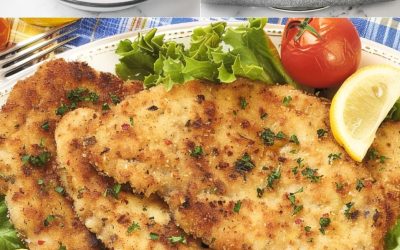 Інгредієнти (4 порції): 4 тонкі скибочки телятини (або курки) (приблизно по 100 г кожен) 100 г панірувальних сухарів 50 г…