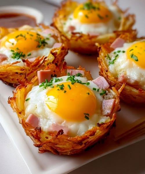 Натхненні американськими картопляними оладками або швейцарськими рьості, ці маленькі гніздечка пропонують французький варіант ідеї бранчу або пікантного сніданку. Поєднання золотистої картоплі, рідкого яєчного жовтка, ароматної шинки та плавленого сиру просто неперевершене. Кожен шматочок — це ідеальний баланс текстур та смаків.