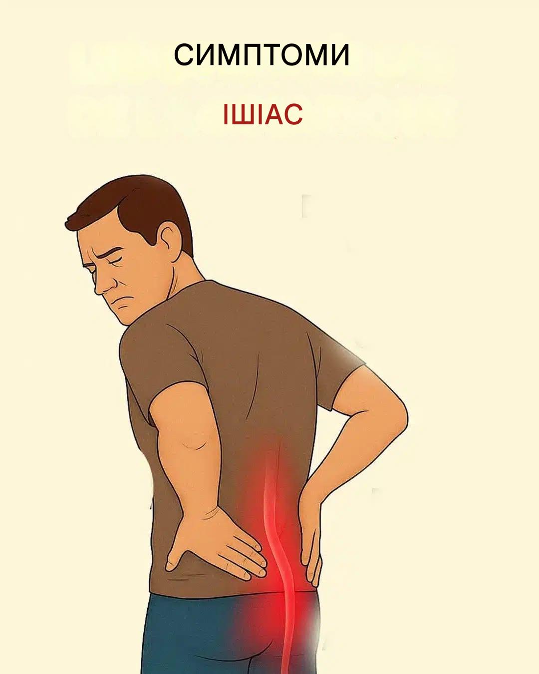 Ішіас зазвичай виникає через грижу міжхребцевого диска, яка стискає сідничний нерв. Він проявляється як біль, що починається в попереку та іррадіює в ногу, іноді супроводжуючись поколюванням або онімінням.