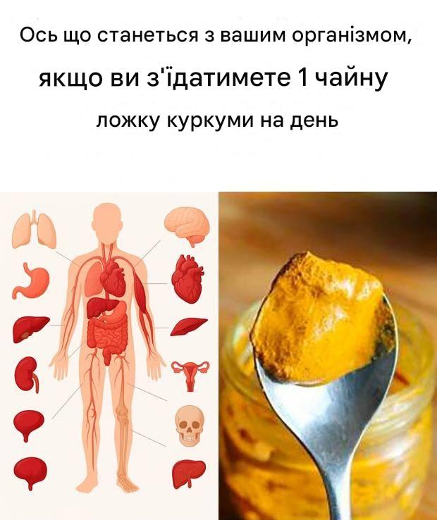 Чайна ложка куркуми на день запобігає запаленню, токсинам, болю та раку.