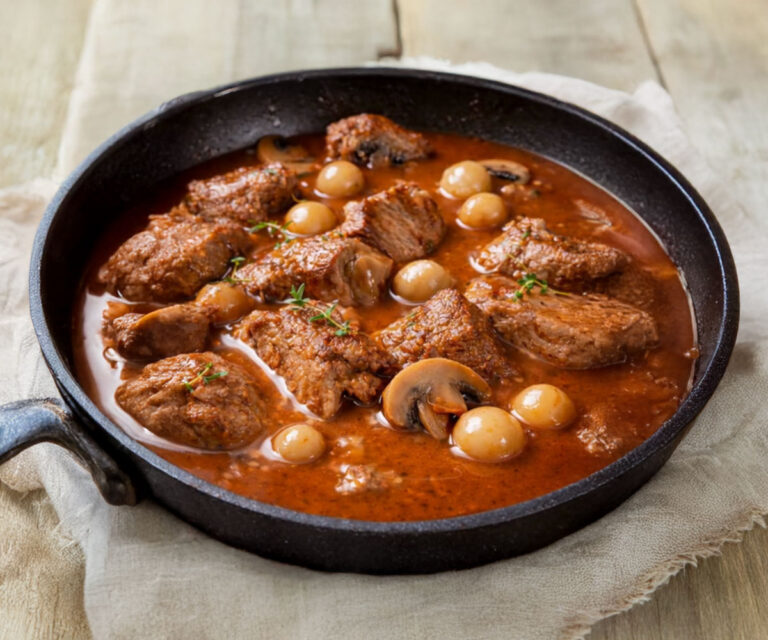 Ця сімейна страва демонструє ніжне, ароматне м'ясо, яке вільно тушкується в томатному соусі з грибами, перловою цибулею, білим вином і травами. Секрет її успіху досягається в делікатному, тривалому часі приготування, який дозволяє смакам повністю розкритися, а м'ясу стати нижнім, що тане в роті.