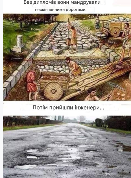 На першому зображенні ми бачимо людей сотень, навіть тисяч років тому. У них не було дипломів, сертифікатів чи наукових ступенів. Вони не були знайомі з сучасними технологіями, комп'ютерами чи складною технікою. Проте вони будували дороги, які простояли століттями. Міцні, рівні та добре продумані дороги, засновані на знаннях, що передавалися з покоління в покоління, досвіді та здоровому глузді. Кожен шар мав своє значення; кожен камінь був закладений з думкою про довговічність, а не про швидкі результати.